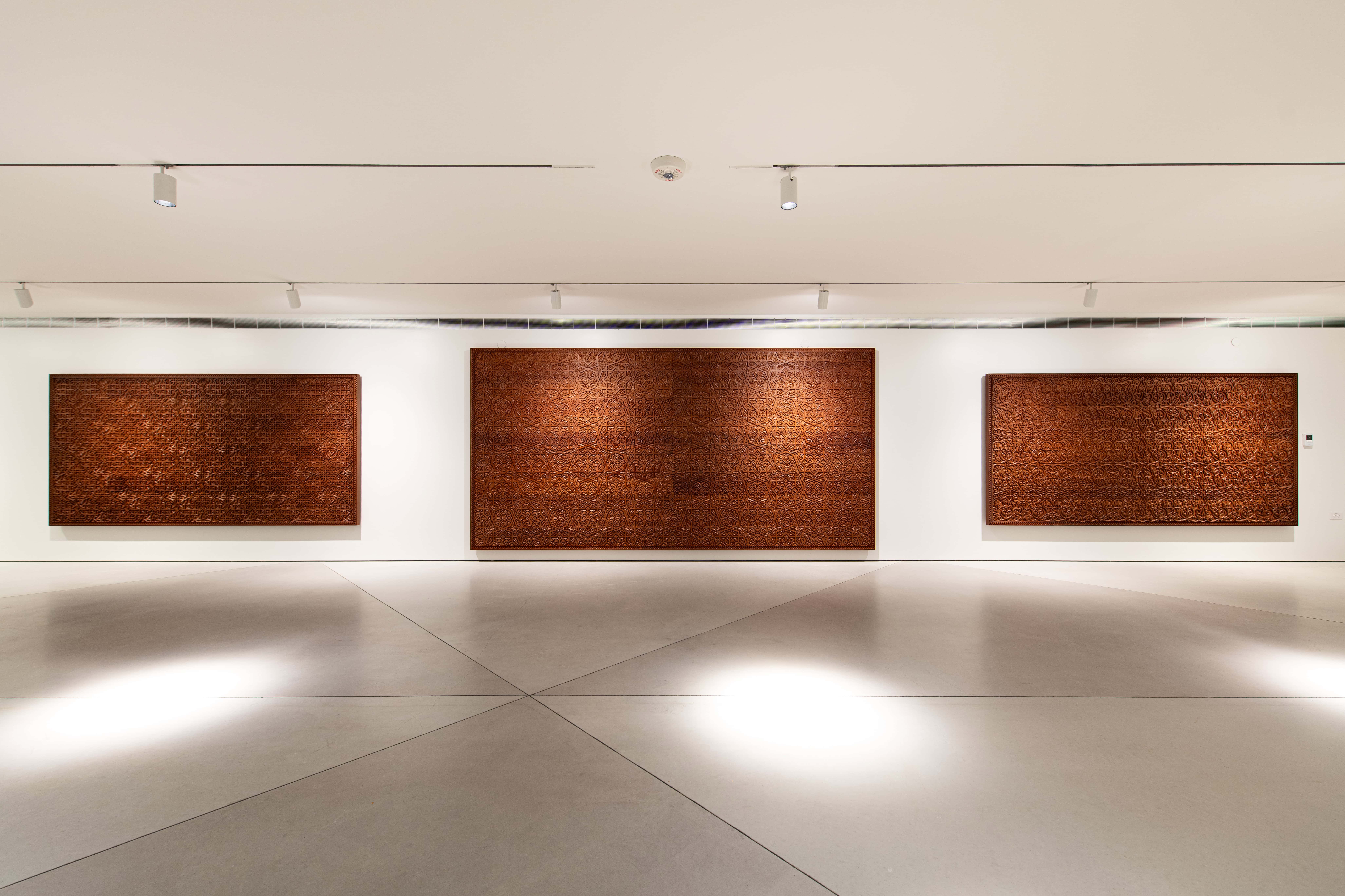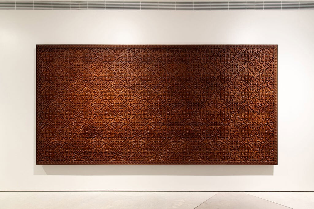 Conceived as a collaboration between artist Mohammed Adra, Senior Design Manager at the Aga Khan Development Network, and master woodworker, Hamza Zidan, these three panels showcase distinct design motifs that draw upon forms from the broad repertoire of ornaments found in traditional Islamic art and architecture. All of the designs are imagined as infinite, extending beyond the edge of the frame. Together they create a dynamic feeling of connection with Islamic architecture without a readily identifiable characteristic of place or time.