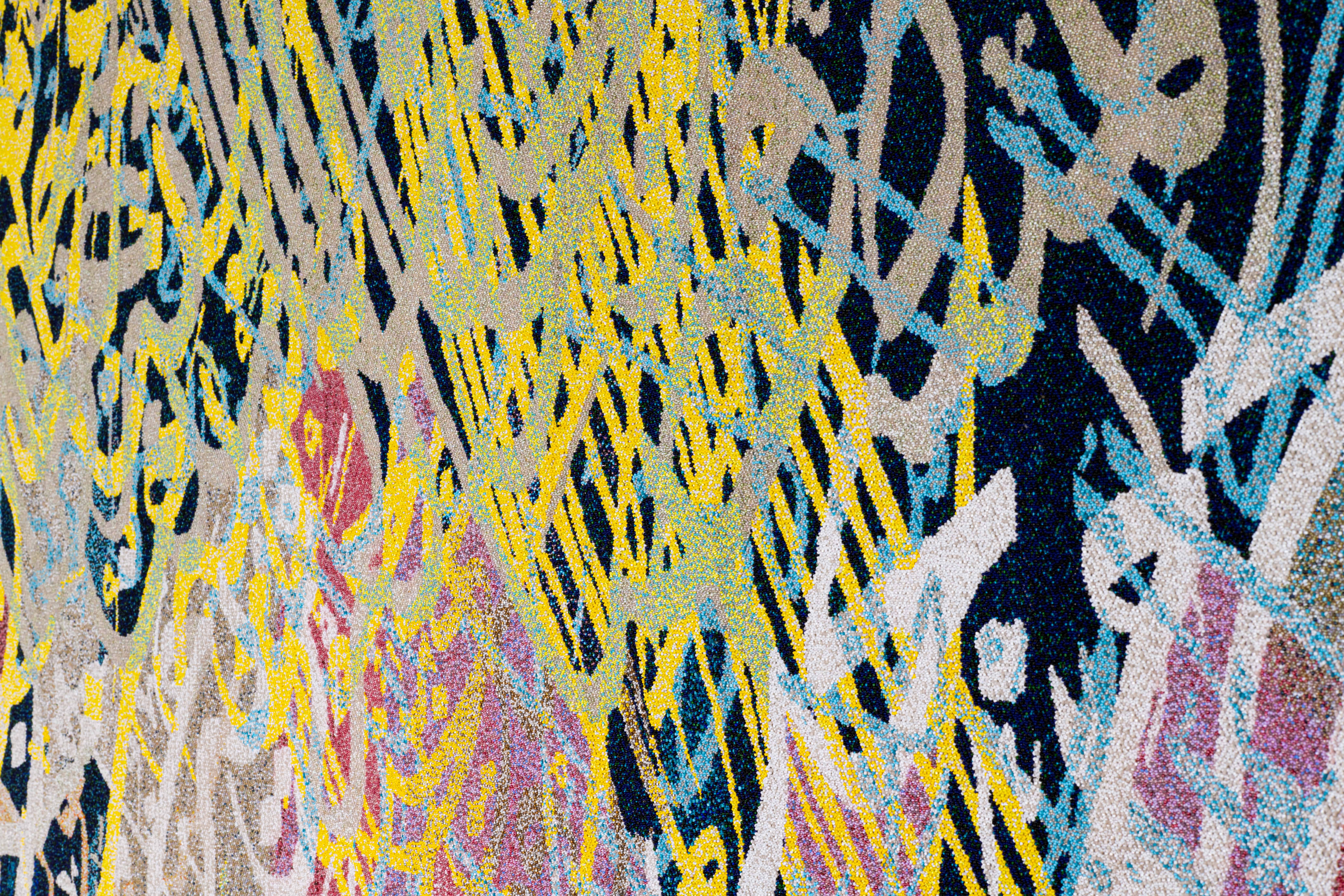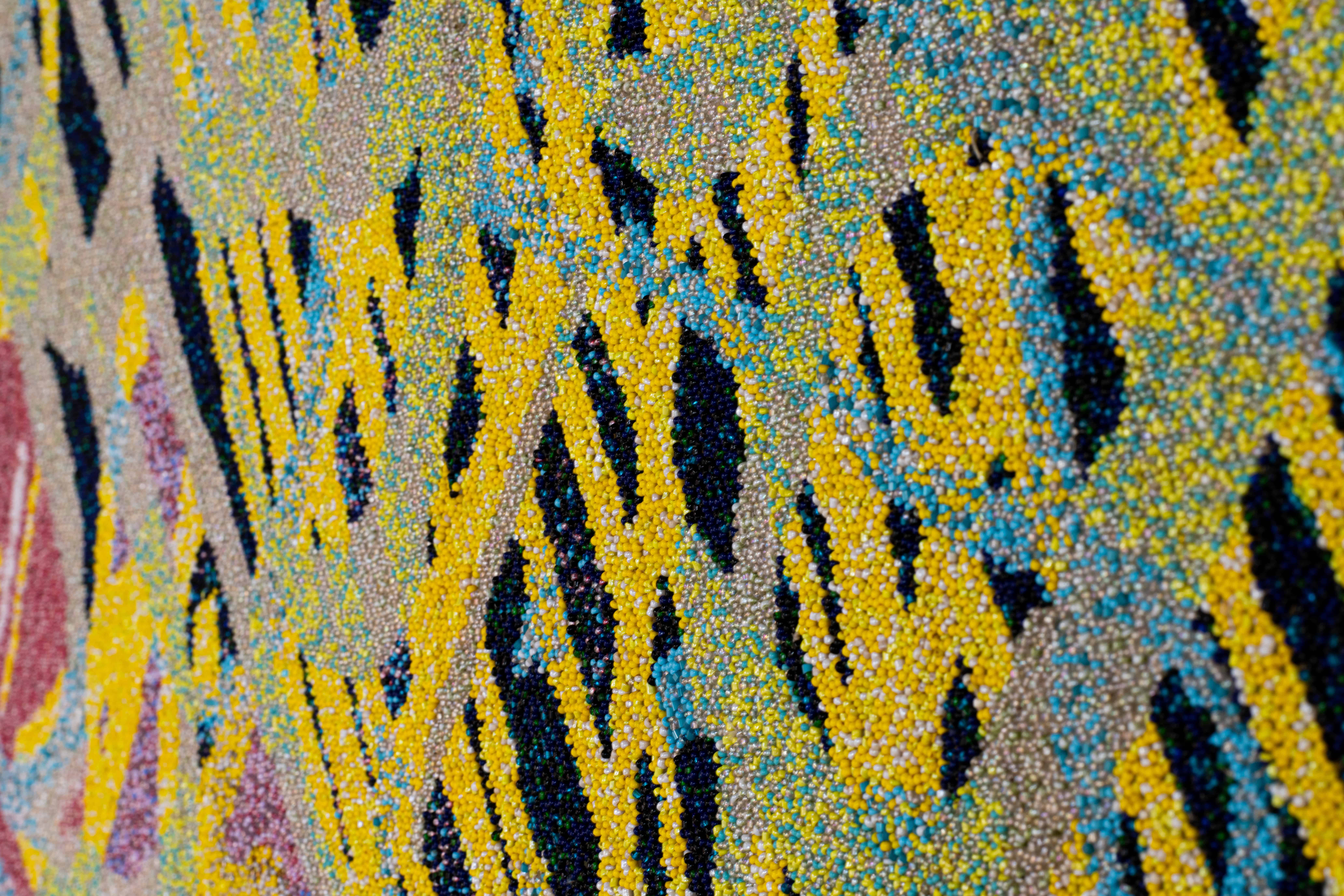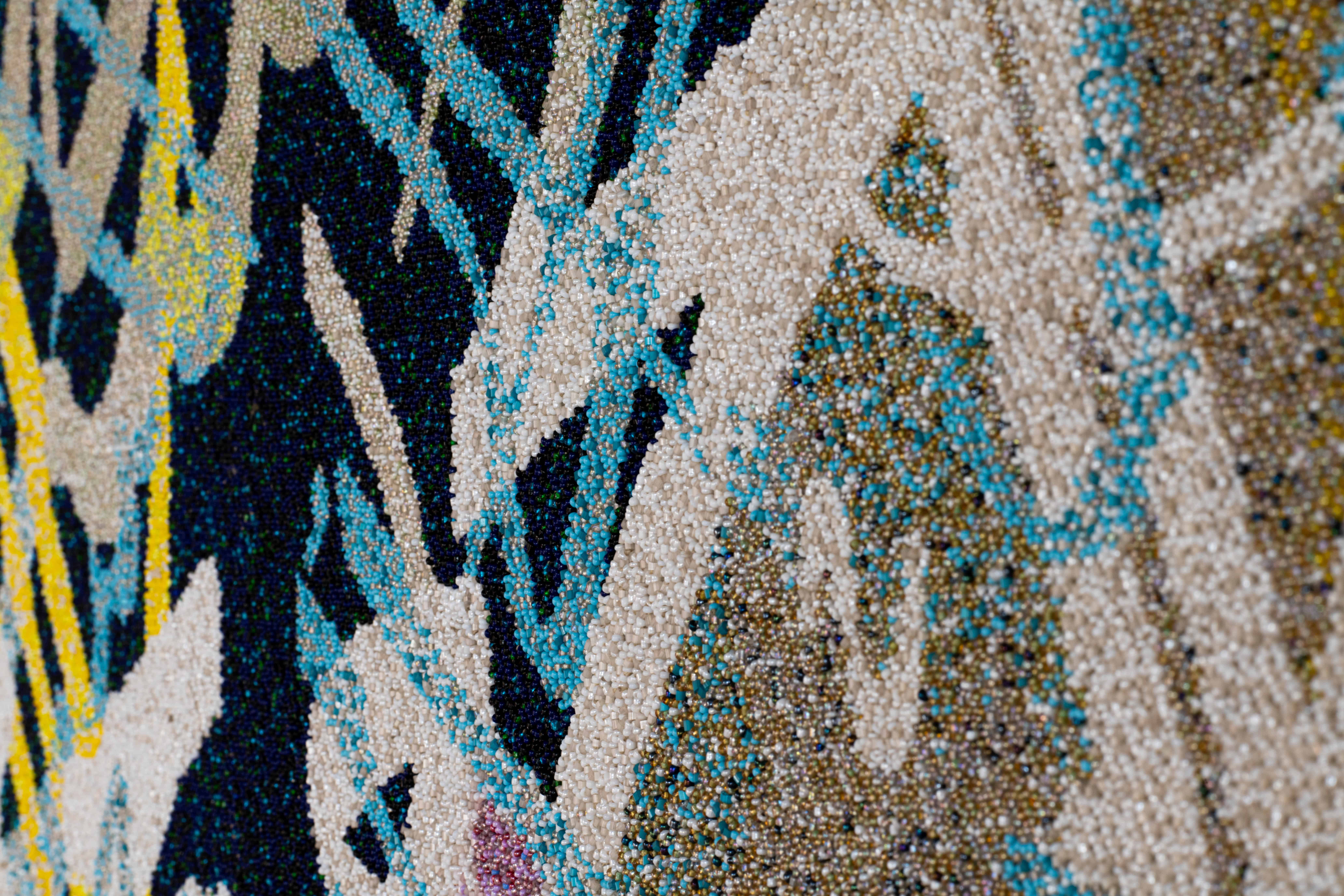 Formed by a staggering four million beads embroidered by hand to a textile substrate, this composition is the result of a collaboration between the Egyptian born British artist Ahmed Moustafa, the Ismailia Helping Society, and twenty Ismaili women in Chitravad Gujarat, India. It is based upon a calligraphic painting produced by Moustafa in 1984, Nocturnal Journey, which commemorates the text of the first ayah of the Surah al-Isrāʾ (Q 17, The Night Journey). The verse describes a journey that Allah brought about where His servant, the Prophet Muhammad (pbuh), travelled by night from the Masjid al-Haram in Mecca to the Masjid al-Aqsa, understood to be Jerusalem, in order to reveal sacred knowledge (ayat) to him.
