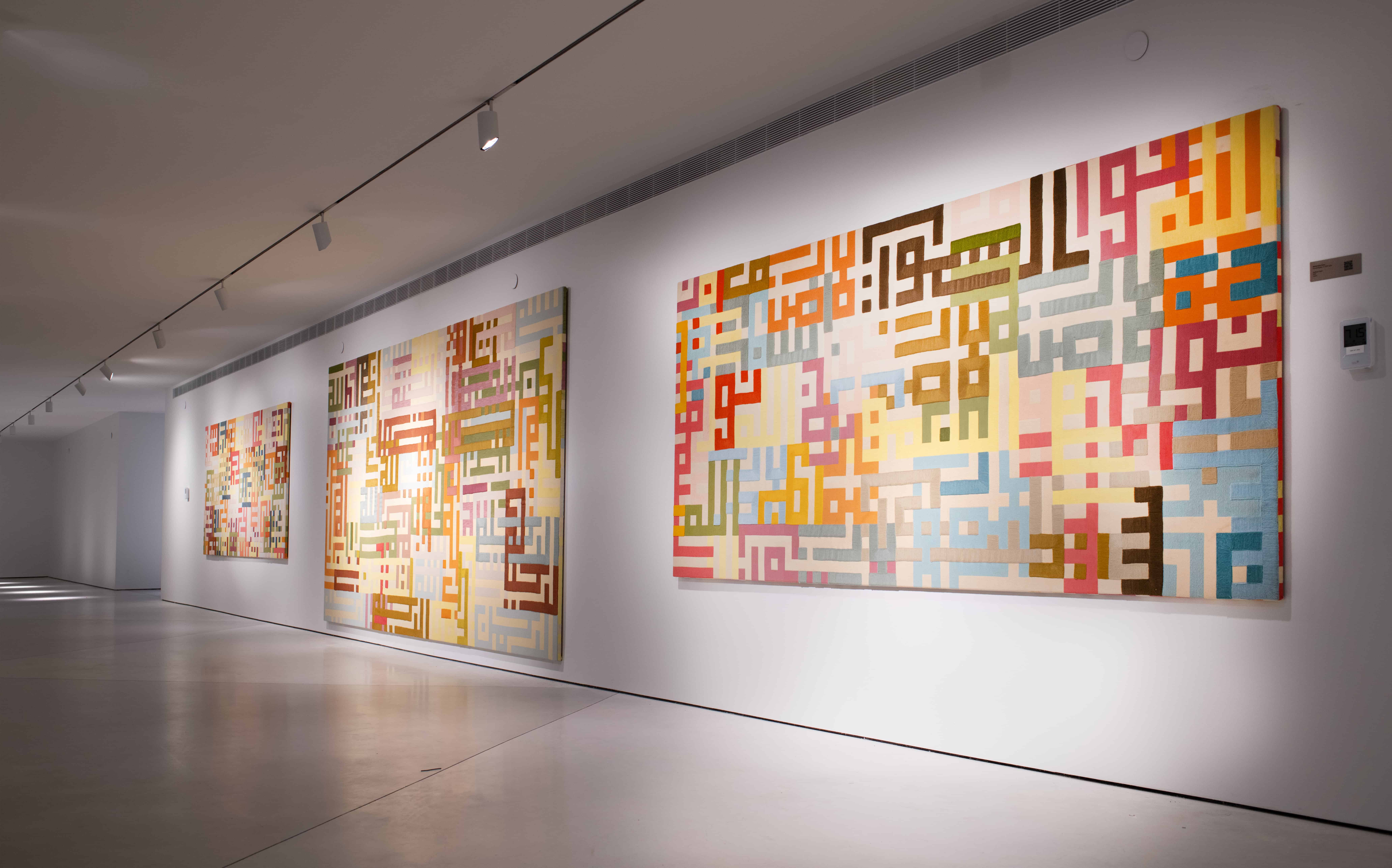 Created by Mohammad Adra and woven at Jaipuria Silk Mills in Bengaluru, India in collaboration with a team led by Mr. Manjunath L. (Jacquard Weaves), Ms. Anjali Barnwal (Embroidery), and Mr. Pradeep V, all under the guidance of Mr. Vikram Jaipuria, this set of tapestries brings together the geometric potential of square Kufic, the colors and textures of cotton yarn, and profound expressions of faith to create dynamic, contemporary compositions. These intricate tapestries were first woven on a jumbo jacquard loom, utilizing eight differently coloured cotton yarns in the weft. Skilled artisans then hand-embroidered elements with acrylic yarns, carefully positioned on the fabric.