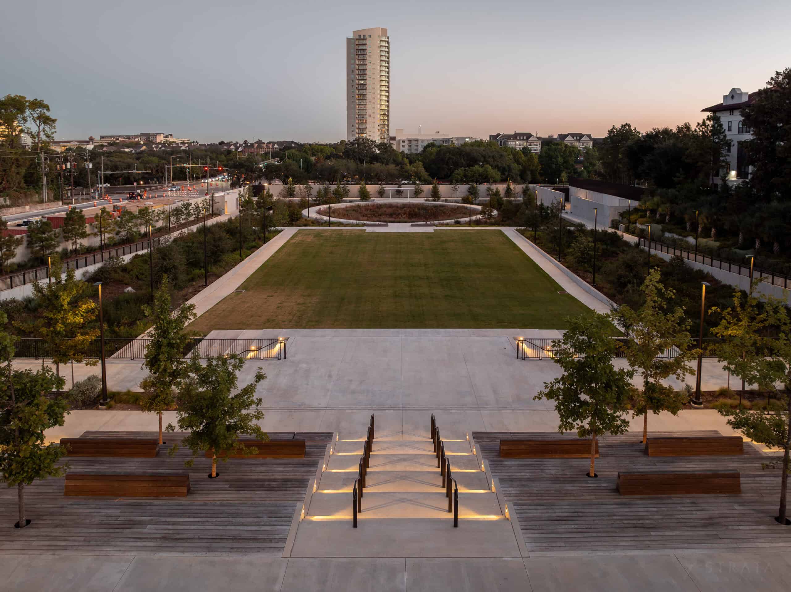 A spacious open lawn with a performance stage and garden views, ideal for large gatherings, film screenings, cultural performances, and sports viewings.