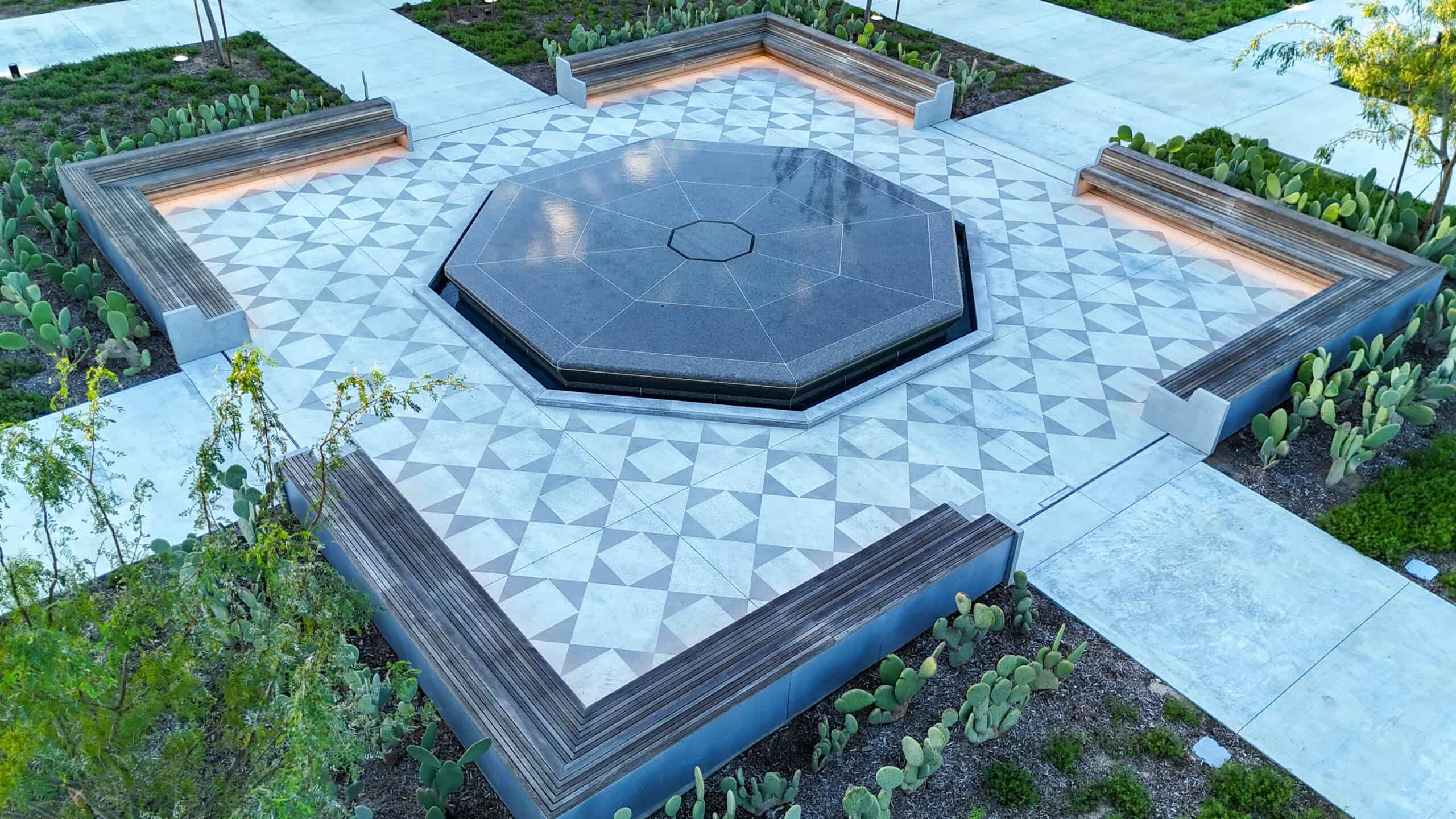 A peaceful outdoor space with a central fountain and bench seating, offering a calm setting for rest and reflection amid lush plantings.