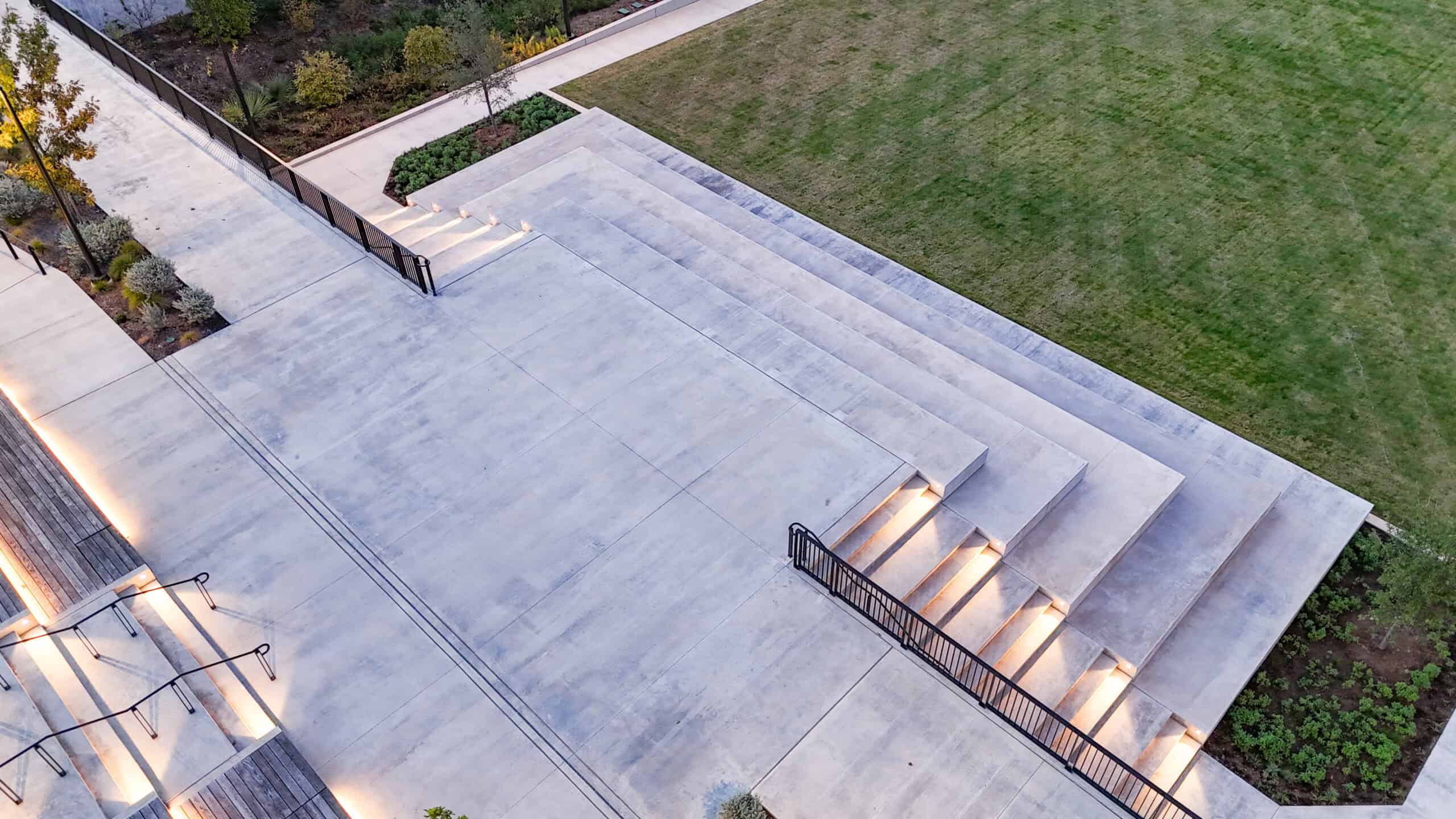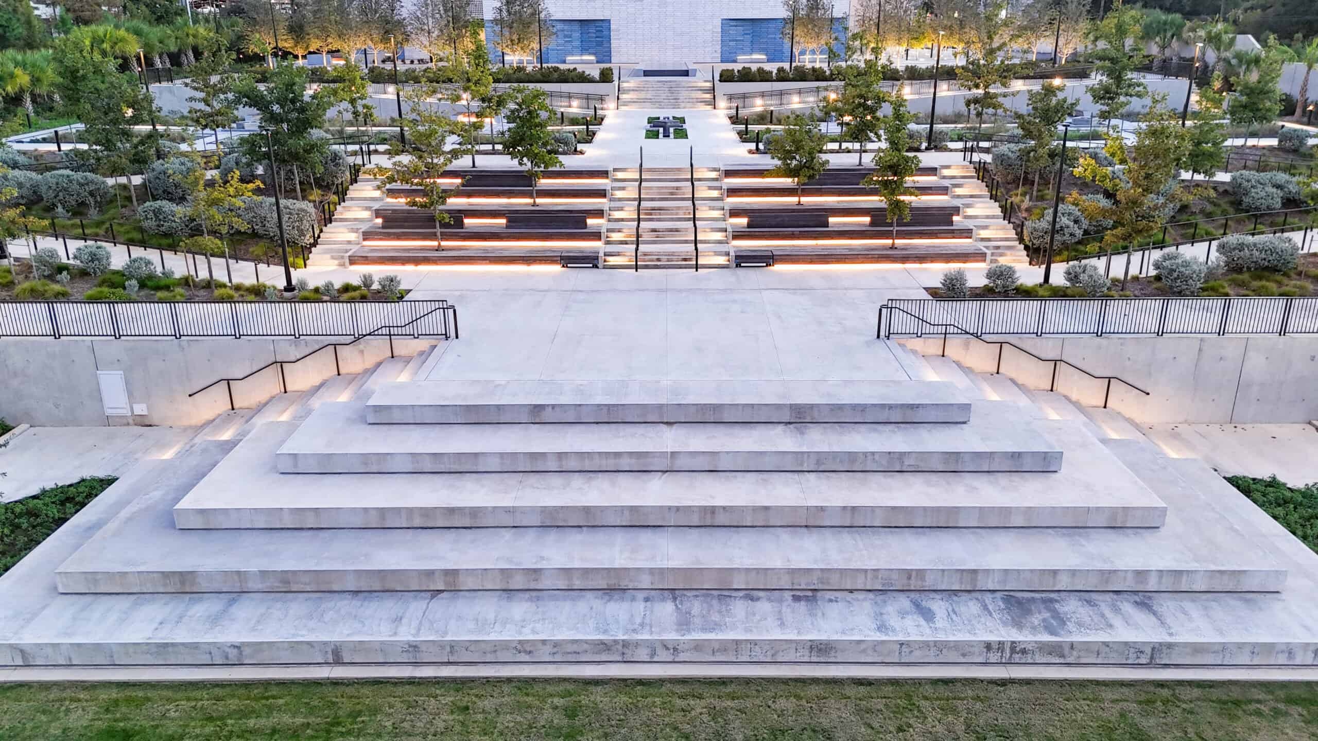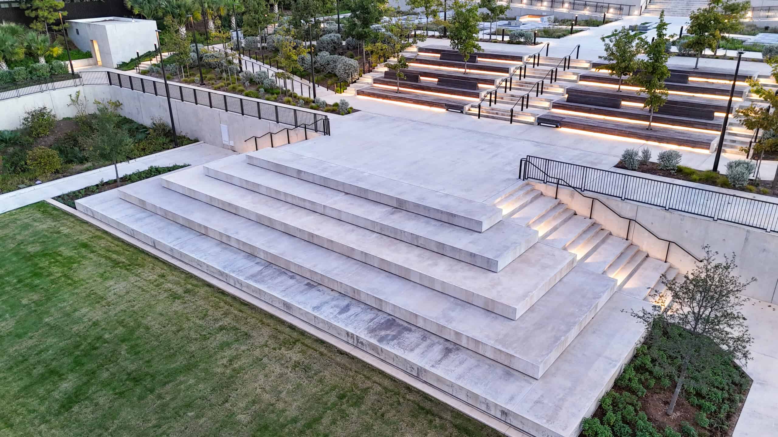 An intimate outdoor venue with a small performance stage, perfect for receptions, performances, gatherings, overlooking the gardens.